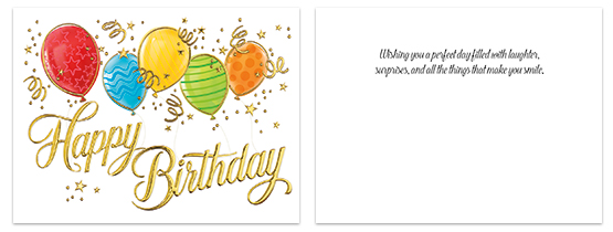 15 - Uplifting Balloons A3402G (5.5" x 7.5") Features shiny gold foil and embossing throughout. Verse: Wishing you a perfect day filled with laughter, surprises, and all the things that make you smile.