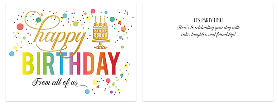 10 - Bright Bubbles From All A3406U (7.5" x 5.5") Features holographic gold rainbow glitter on the embossed calligraphy and cake Verse: It's party time! Here's to celebrating your day with cake, laughter, and friendship!