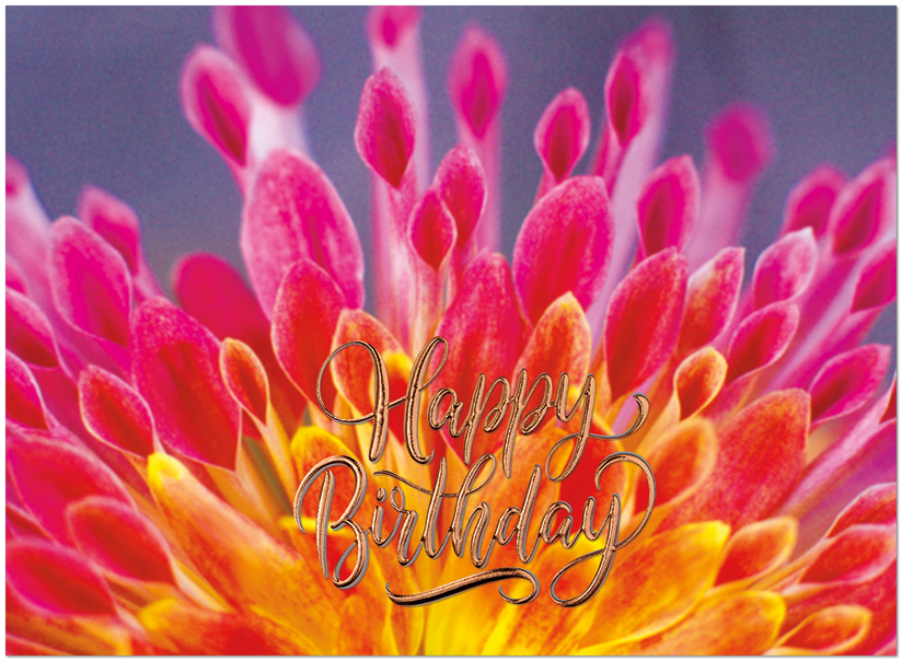 This bright, colorful dahlia features a rose gold foil with embossed calligraphy. Truly a stand-out card. Printed on matte FSC® paper.